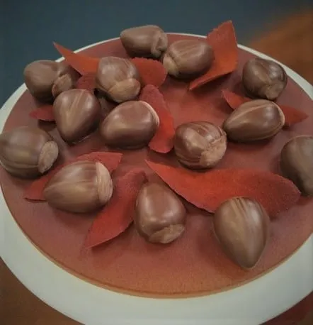 Un dessert que vous ne trouverez nulle part ailleurs : une belle couche de sorbet plein fruits Poire, posée sur un épais nappage de crème glacée aux Marrons aromatisée au Whisky. L’ensemble repose sur un lit de Génoise croquant avec des décors chocolat maison.