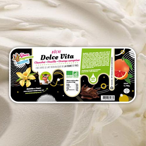 La Dolce Vita, c’est le bonheur en bûche glacée ! Sous son nom qui chante, la Dolce Vita réunit tout ce qu’on aime : un fond moelleux aux amandes, et une crème glacée au chocolat intense recouverte par l’exquise douceur d’une glace à la Vanille de Madagascar, avec, au cœur, une vague ensoleillée d’orange sanguine de Sicile (sorbet). Une escapade sensorielle née à la Ferme Saint-Yves, pour celles et ceux qui croient encore aux plaisirs simples… et aux desserts qui font rêver.